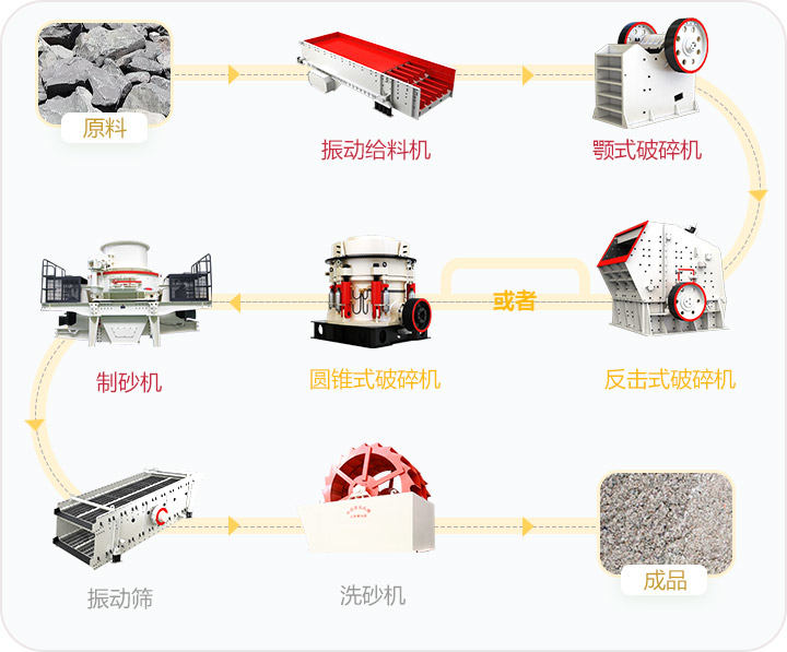 設(shè)備配置:顎式破碎機(jī)、反擊式破碎機(jī)或液壓圓錐破,制砂機(jī),洗砂機(jī),圓振動(dòng)篩等設(shè)備